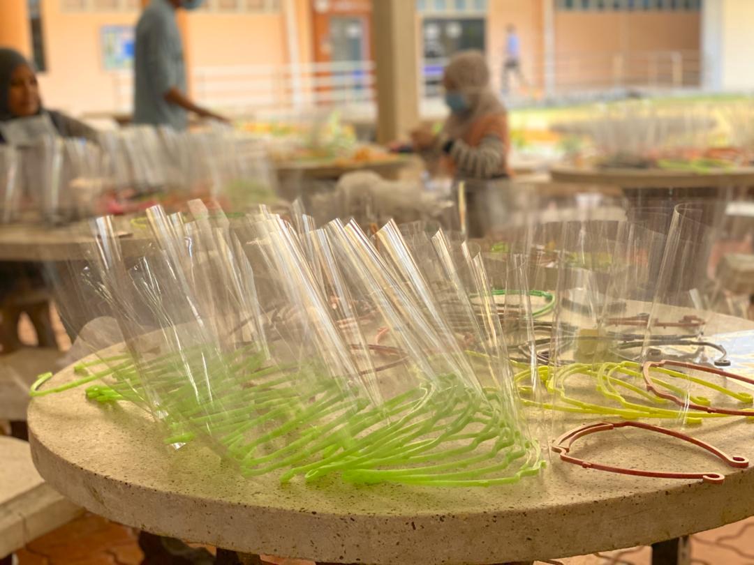 Aktiviti memasang plastic shield pada 300 frame 3D face shield yang akan diagihkan kepada frontliner kesihatan dan staf makmal di Hospital USM, HRPZ II dan Hospital Tumpat. Pecahan agihan adalah seperti berikut: