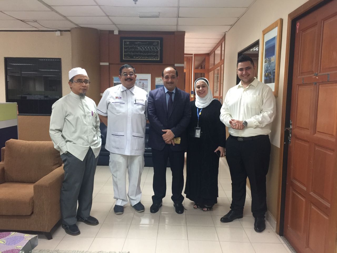 KOTA BHARU, 18 Disember 2016 - Pihak Persatuan Alumni Doktor USM (PADU) mengucapkan selamat datang kepada pelajar sarjana muda antarabangsa pertama MD (USM) yang mendaftar dalam fakulti Pengajian Sains Perubatan, Universiti Sains Malaysia, Mustafa Khalid Ibrahim (paling kanan) 19 tahun dari Iraq. President PADU, Profesor Dato’ Dr. Jafri Malin Abdullah telah secara rasmi menjadi mentor kepada Mustafa dari tahun pertama”. Beliau berkata, “Saya merasa berbangga dan berbesar hati kerana memilih saya dari perintis kumpulan pengajian perubatan USM pertama untuk menjadi mentor pelajar ini.” Selain Mustafa, Profesor Madya Dr. Suhair Abbas Ahmed (dua dari kanan), Pakar Hematologi yang telah bekerja, penyelidikan, dan mengajar pelajar undergraduate dan postgraduate selama 16 tahun, bapa kepada Mustafa, Dr Khalid Ibrahim (tengah), Dr Jafri Malin Abdullah (dua dari kiri), mentor kepada Mustafa dan Profesor Dr. Mohd Suhaimi Bin Ab. Wahab (paling kiri), Pakar Perunding Pediatrik dan Farmakologi Klinikal dan juga Timbalan Dekan (Akademik). Tambah beliau lagi, “Sebagai Presiden PADU, saya teruja bahawa kita akan mempunyai alumni perubatan antarabangsa di peringkat sarjana muda.”