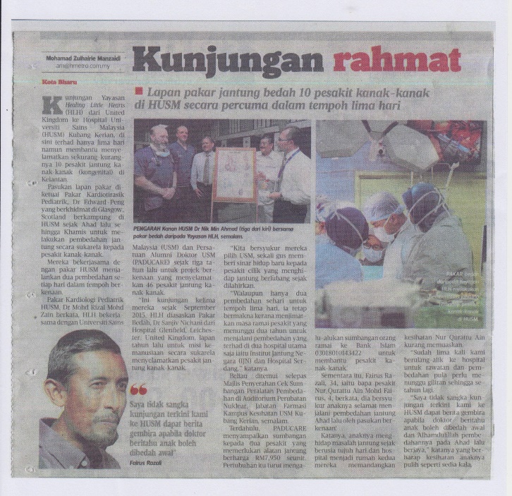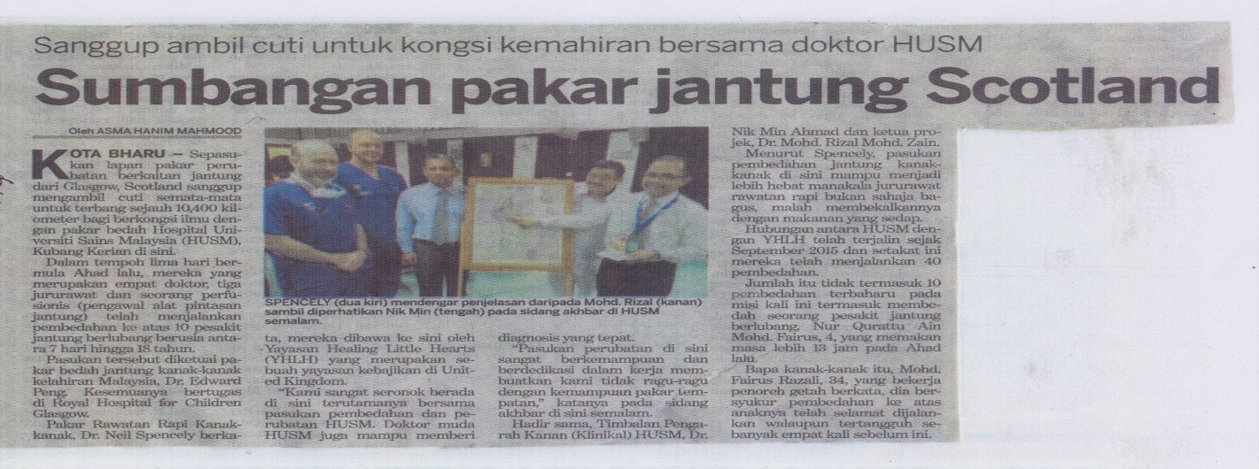 KUBANG KERIAN, 24 September 2017 - Pihak PADUcare telah membuat satu majlis kecil sempena kedatangan kumpulan perawat ‘Hole in The Heart’ sebagai tanda penghargaan. Kumpulan perawat tersebut terdiri daripada 8 orang yang diketuai oleh Dr. Edward Peng (Pakar Kardiotirasik Pediatrik) yang hadir selama 5 hari, pada 24 – 28 September 2017. Majlis tersebut juga dihadiri oleh Timbalan Pengarah Kanan, Bahagian Klinikal Hospital Universiti Sains Malaysia (HUSM), Dr. Nik Min Ahmad mewakili Pengarah Hospital.